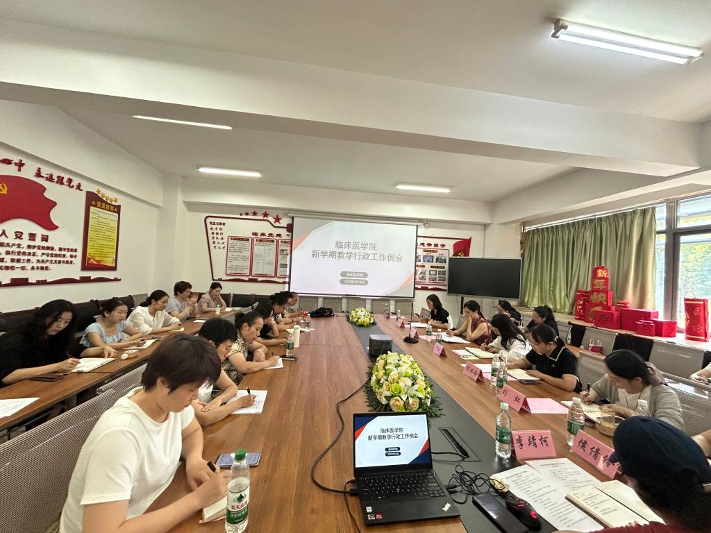 为确保学院各项工作顺利展开、有序推进,9月18日下午,临床医学院在行政南楼201会议室召开新学期教学行政工作例会。学院院长谭丽、党总支副书记廖开兰出席会议,各三级部门负责人、教研室主任、实训中心主任、教研室秘书及行政干事参加会议。会议由综合办主任李靖柯主持。