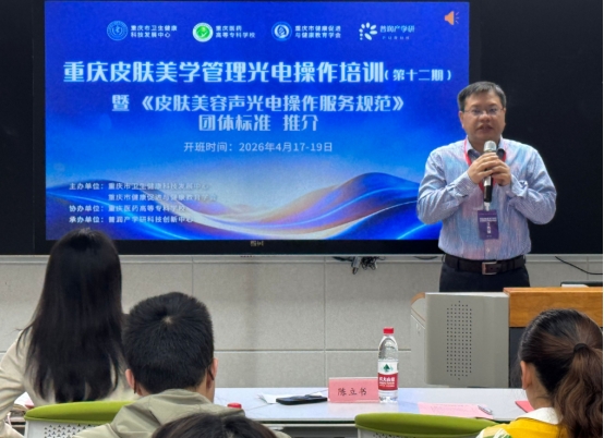 陈立书致辞,对全体学员表示热烈欢迎,并指出,作为西南地区医疗美容人才培养的重要基地,学校拥有深厚办学积淀与雄厚师资力量,建有先进的数字医美实训中心及“双创”美容实训孵化基地,为学员提供了高水平的学习实践平台。本次培训依托学校优质资源,精心设置理论与实操相结合的光电技术课程体系,将提升从业人员的专业技能与规范操作水平,助力医美行业高质量发展。他勉励学员珍惜学习机会,学以致用,为求美者保驾护航,共同推动行业健康规范发展。